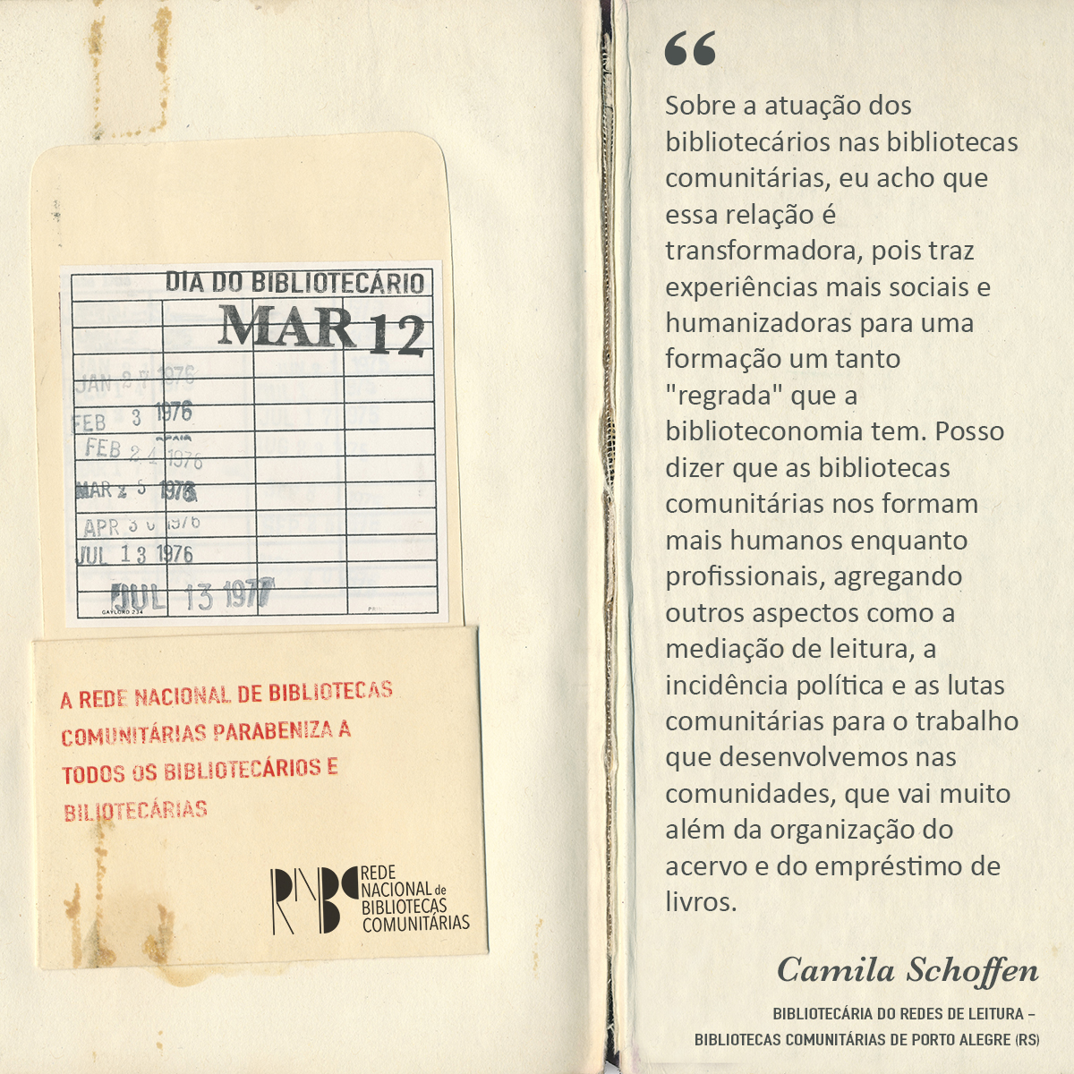 A Rede Nacional de Bibliotecas Comunitárias deixa registrada sua homenagem a esses profissionais essenciais e estratégicos para a democratização da cultura e que tanto tem contribuído na atuação das bibliotecas comunitárias. Da ficha de empréstimos aos avançados sistemas de catalogação; seja nas bibliotecas, nas empresas, nas ONG’s e onde compartilhar, gerir, divulgar, organizar informações é estruturante – é lá que bibliotecários e bibliotecárias devem estar.